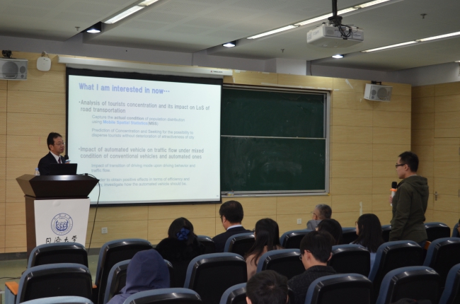 此次讲座由杨晓光教授主持,主讲人Nobuhiro UNO首先参照最近日本国内的一场主要针对交通工程和规划的会议的会议结构,对日本的交通科学研究趋势进行了概述。就日本的研究趋势,主讲人介绍了日本京都大学智能交通团队近期进行的研究活动。在接下来的讲座中还依次介绍了以下几个话题:分析大数据以提高公共交通使用率、分析驾驶模拟器以评价安全信息的效果、对游客分布和交通拥堵等问题的分析。Nobuhiro UNO教授带来了一场逻辑清晰又不失生动有趣的讲座。在讲座中,教授向同学们分享了大量事例,让同学们更好地感受其研究领域下的社会人文背景,以及研究领域的创新点。在演讲过程中,在场师生不时以热烈的鼓掌声,向教授表达敬佩与感谢之情。