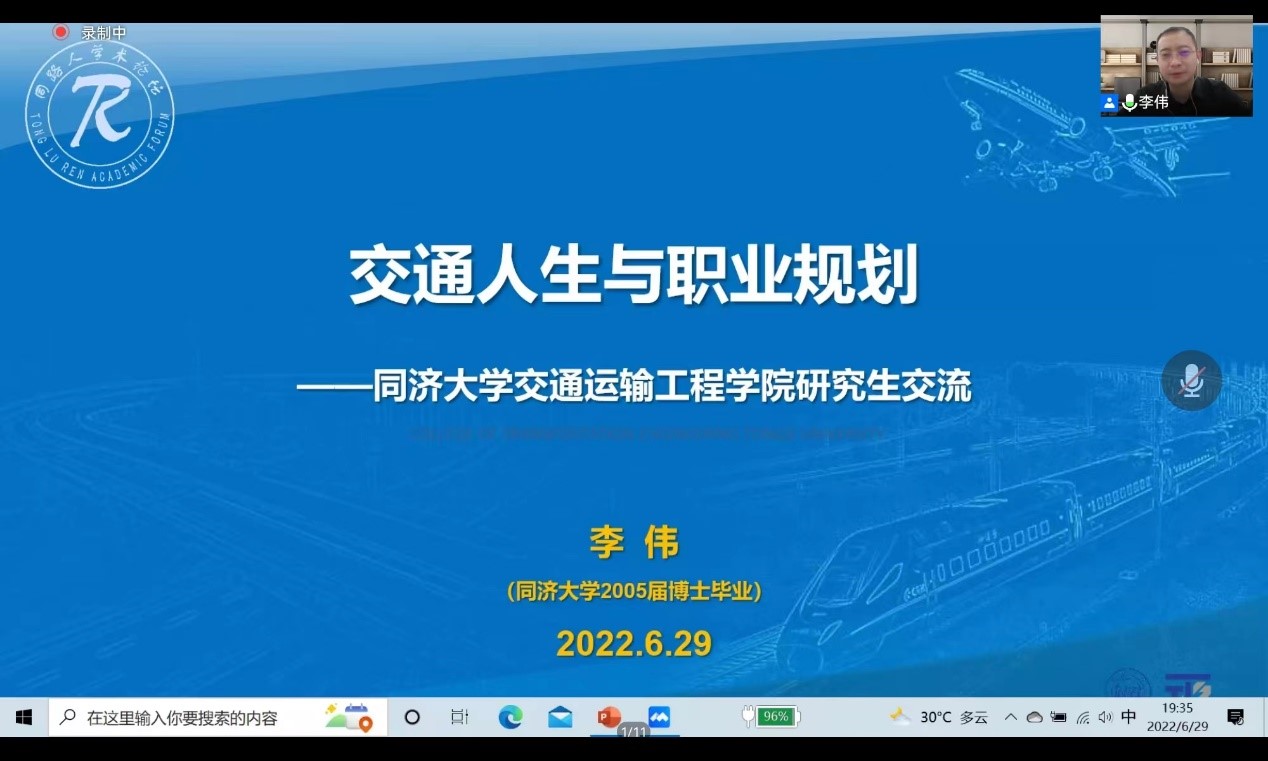 6月29日晚上19:30-21:30,第488期同路人学术论坛于线上成功举行。本次论坛主题为“交通人生与职业规划”,由tyc8722太阳集团城工学博士,阿里云交通物流行业副总经理,规划咨询团队负责人,阿里巴巴数智交通研究院副秘书长李伟,围绕tyc8722太阳集团城研究生在毕业求职中面临的就业困惑与热点关切,结合自身的近20年从业实践,拟从“个人成就与时代价值”、“交通人的职业理想与从业心得”、“职业规划思考建议”三个方面为同学们做些总结梳理,权当“他山之石”或“前人探索”,供我们毕业择业与职业规划参考。
