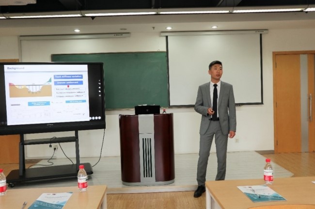 Frank Rackwitz教授介绍了包括三轴试验、空心圆柱试验等一系列的土性研究工作,并据此构建了软土的本构模型;博士生Chanaka Warnakulasooriya介绍了2D车-轨-路耦合模型,并做了实例分析模拟;陕耀副教授聚焦于高速铁路过渡段,建立数值模型对过渡段的动力特性进行分析;付龙龙助理研究员针对高速铁路颗粒材料特性,介绍了其离散元模拟的一系列成果;狄宏规助理教授介绍了基于频域求解的车-轨-隧-土耦合模型并对结果做了分析讨论;博士生张骁针对高铁路基颗粒材料的动力特性,讨论了细观颗粒材料的动力响应。在主题报告中,与会的师生围绕着演讲嘉宾的汇报内容,展开了热烈的讨论与交流。